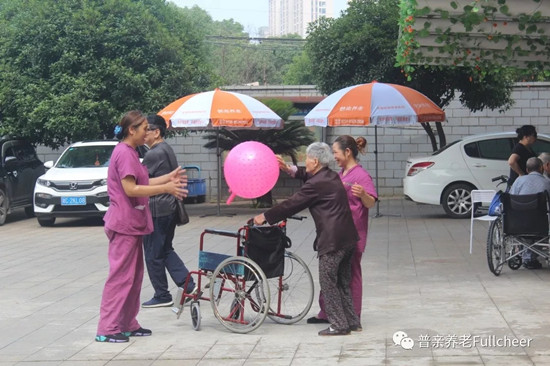 參觀正值老人們上午活動(dòng)時(shí)間,護(hù)理員帶著老人們?cè)谠鹤永镒鲥憻�,拍球、百步走、麻將、象棋,多樣的康樂活�?dòng)形式頗受考察團(tuán)的好評(píng)。