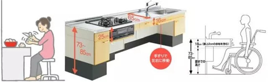 根據(jù)老人身高,重新定義廚房高度吧:市面上正常比較認(rèn)可的普遍柜臺合適高度為「身高÷2+5~10cm」。假如臺面低了容易增加彎腰時的負(fù)荷,臺面高了一直站著烹飪?nèi)菀桩a(chǎn)生肩膀疲勞的痛苦和感受。另外,能坐下來工作的廚房裝修也是非常值得推薦的。