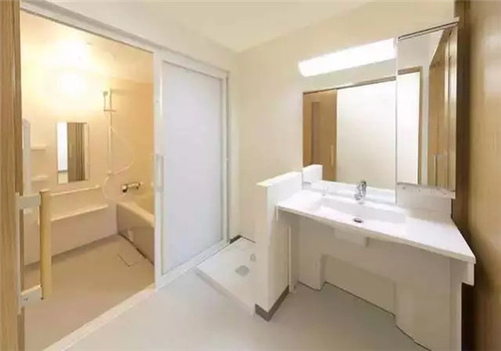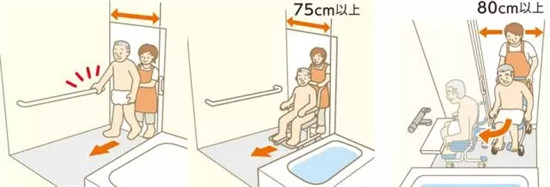 直接進(jìn)入浴室時,需75cm以上;當(dāng)進(jìn)入需迂回時,門開尺寸至少80cm以上(洗浴過道容身處亦大于80cm);進(jìn)入浴室路上應(yīng)沒有障礙。