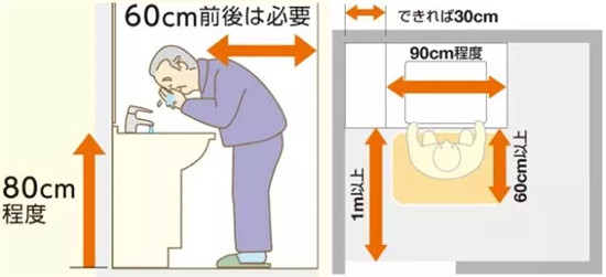 老人站立時,80cm是化妝柜的舒適高度,可以減少腰部的負(fù)擔(dān),以及水不容易流向肘部而滴落,深度空間上需要達(dá)到60cm,這樣的空間站或者坐都恰好了。