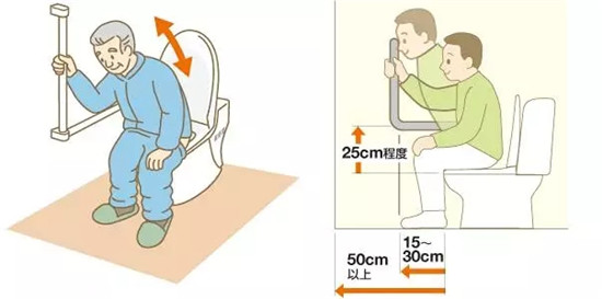 大家都知道起身的時候:手撐著的力氣需要支撐整個身體,而由順手處的扶手拉的過程則省力許多(可以自己做個試驗(yàn)),所以扶手的位置應(yīng)設(shè)定在離馬桶15~30mm的墻壁上。