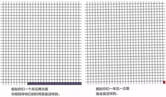 對于父母:假如你們一個月見兩次面,你能陪他們的時間就20格,假如你們一年就見一次面,你能陪他們的時間就那么短短1格。