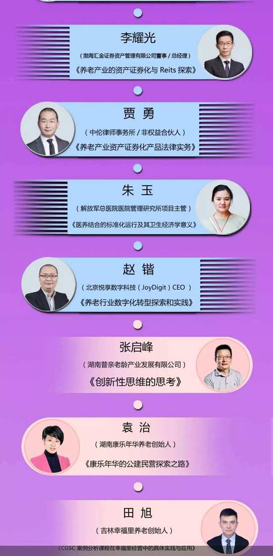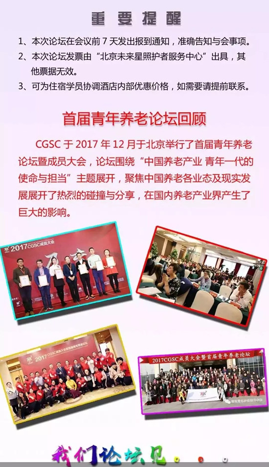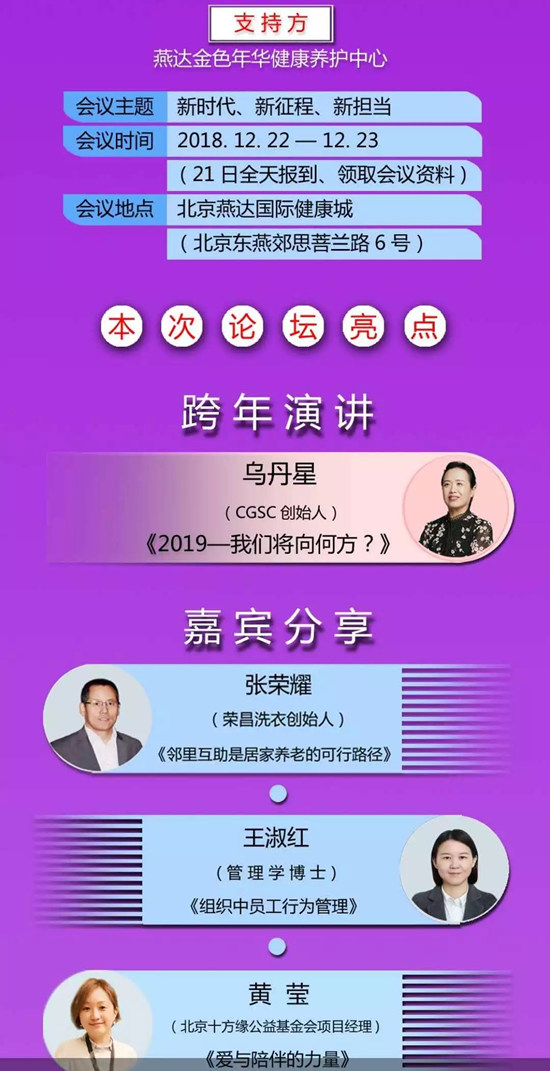 告別2018,迎接2019。由CGSC主辦的《第二屆青年養(yǎng)老論壇》將於2018年12月22-23在北京舉行。每年圣誕節(jié)前的那個周末,來一次回顧與反思,聚智聚力聚心,跨界跨域跨行,為邁進(jìn)下一個新起點洗腦充電。年輕一代,是中國明天的希望,更是中國養(yǎng)老產(chǎn)業(yè)明天的希望。CGSC,給他們家的溫暖,發(fā)聲的平臺,前行的動力,明天的思考。青苗千人計劃,臺灣公益游學(xué),月度專業(yè)分享,眾人陪你讀書…以70后為主的專委會團隊,以互聯(lián)互通互助為核心理念的平臺搭建,CGSC,一個養(yǎng)老行業(yè)的公益組織,終將會成為一面引領(lǐng)中國養(yǎng)老產(chǎn)業(yè)年輕一代的偉大旗幟。中國養(yǎng)老,靠什么走出低谷,走向明天?不是靠政府,不是靠政策,靠的是三大力量: 資本的力量,專業(yè)的力量,公益的力量。靠資本為引擎拉動產(chǎn)業(yè),靠專業(yè)為依托提升品質(zhì),靠公益為藍(lán)海推波助瀾。2018,在資本上我們付出了怎樣的代價?在專業(yè)上我們有了哪些提升,還存在哪些缺陷?在公益上我們忽略了哪片藍(lán)海?在跨界上,在創(chuàng)新上,在新型組織構(gòu)建上,在商業(yè)模式上,還有哪些機會與挑戰(zhàn)?兩天,來自不同領(lǐng)域的24位演講嘉賓,老中青三代,將傾情分享他們的經(jīng)驗與心歷路程。最后收尾,仍是我的跨年演講《2019,我們將向何處?》。沒有名角,沒有高大上。一顆平常心,一群有志者。一樣的論壇,期待不一樣的收獲…北京,1222,我們不見不散!