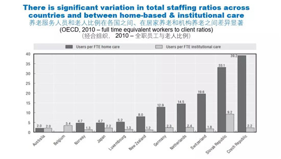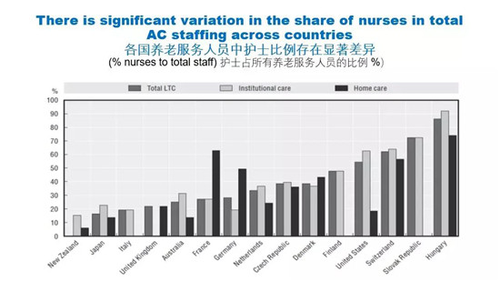 在OECD國家中,養(yǎng)老服務(wù)人員護(hù)士比例差別是很大的,比如新西蘭的比例就很低,而東歐國家相對比例就比較高。從OECD國家來看,它沒有一個(gè)標(biāo)準(zhǔn)的模式,在中國也是一樣,各個(gè)地方怎么做差別都是很大的,都是根據(jù)自己的條件來做的。