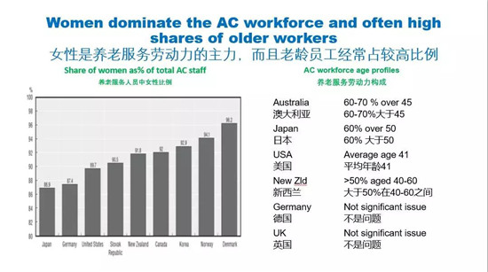 另一個(gè)共性問題是:女性是養(yǎng)老服務(wù)隊(duì)伍的主體,而且老齡員工占較高比例�?梢钥吹�,德國和英國老齡員工的占比不是那么高,但是其他國家女性比例比較大,而且年齡比較大,跟中國類似。