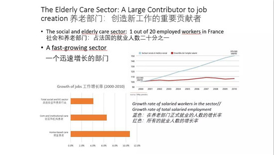 從法國來看,整個(gè)養(yǎng)老部門的就業(yè)占到全國就業(yè)的1/20,而且隨著老齡化的加深這個(gè)數(shù)字增長很快,是一個(gè)直線上升的態(tài)勢,而全國的就業(yè)增長是一個(gè)平穩(wěn)的趨勢,養(yǎng)老部門是迅速增長的部門。養(yǎng)老部門是創(chuàng)造新工作的重要貢獻(xiàn)者,因此要特別重視養(yǎng)老部門就業(yè)。關(guān)鍵是如何把人吸引進(jìn)來,讓照護(hù)人員隊(duì)伍穩(wěn)定,滿足老年人的養(yǎng)老服務(wù)需要。