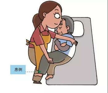 3)待老人站穩(wěn)后,照護員以足為軸慢慢旋轉(zhuǎn)身體,使老人背部轉(zhuǎn)向輪椅,臀部正對輪椅正面,然后使老人慢慢彎腰,平坐至輪椅上。如果老人左側(cè)肢體有力,可囑咐老人用靠近輪椅的左側(cè)手扶住外側(cè)把手,照護員用腿抵住老人患側(cè)(右側(cè))膝蓋,協(xié)助其轉(zhuǎn)身坐入輪椅中。