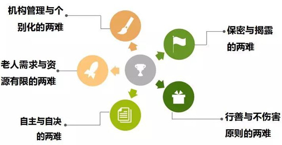 老年長期照護機構(gòu)的服務(wù)概念因為機構(gòu)本身具有控制的特性,一定會面臨照護上的倫理議題。所謂機構(gòu)本身的特性指的是為了執(zhí)行照護與提供給老人具有一定生活質(zhì)量的服務(wù),使照護本身面臨了偏好的沖突、老人的問題行為、有限的資源、老人無法選擇與誰住在一起所產(chǎn)生的問題等,衍生出在日�;顒又欣先俗饑�、自決、人身安全與健康等復(fù)雜的討論。