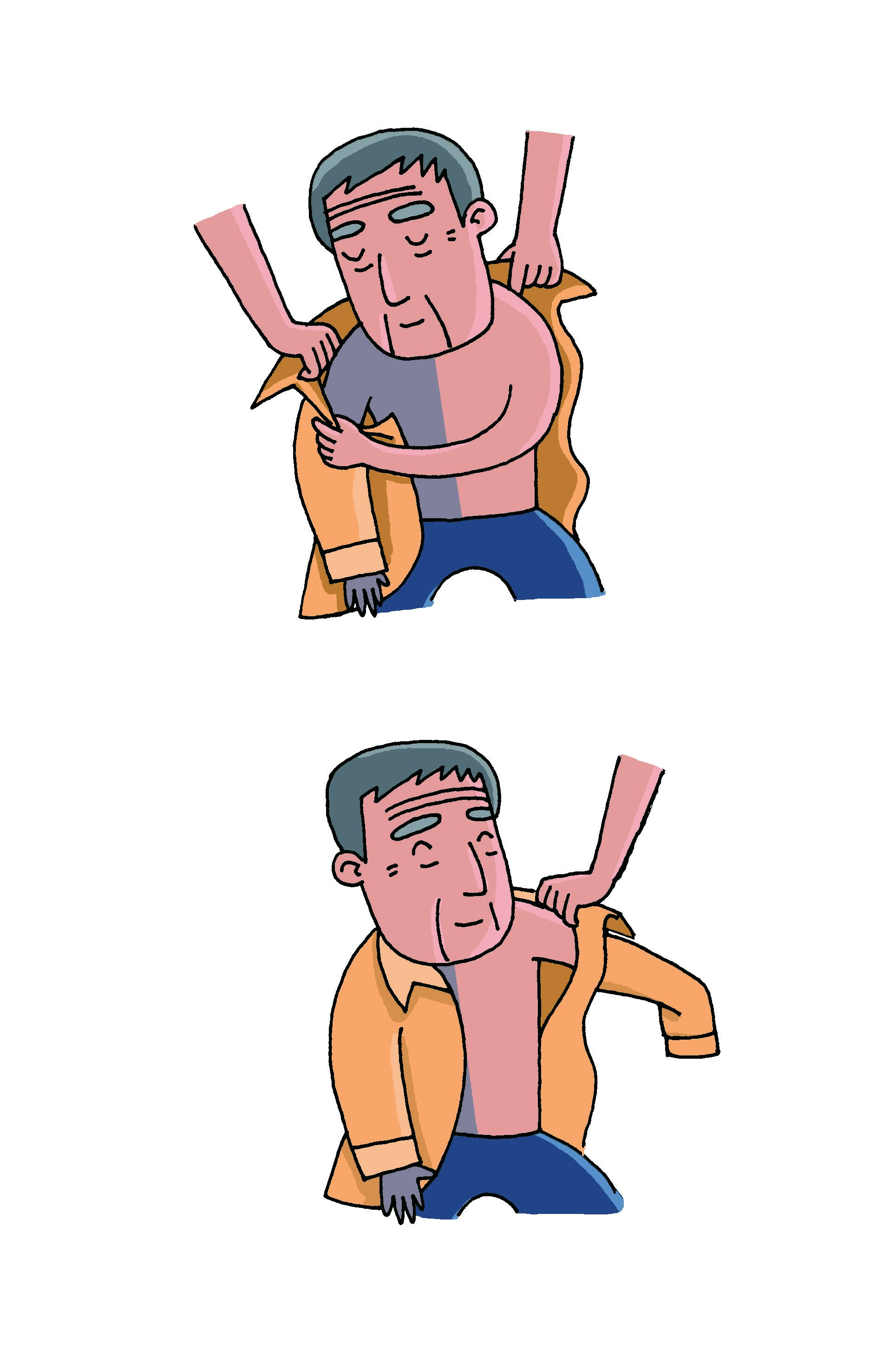 1、先將一直衣袖全部套進(jìn)患側(cè)手臂,再拎住衣領(lǐng)將衣服披到肩上。