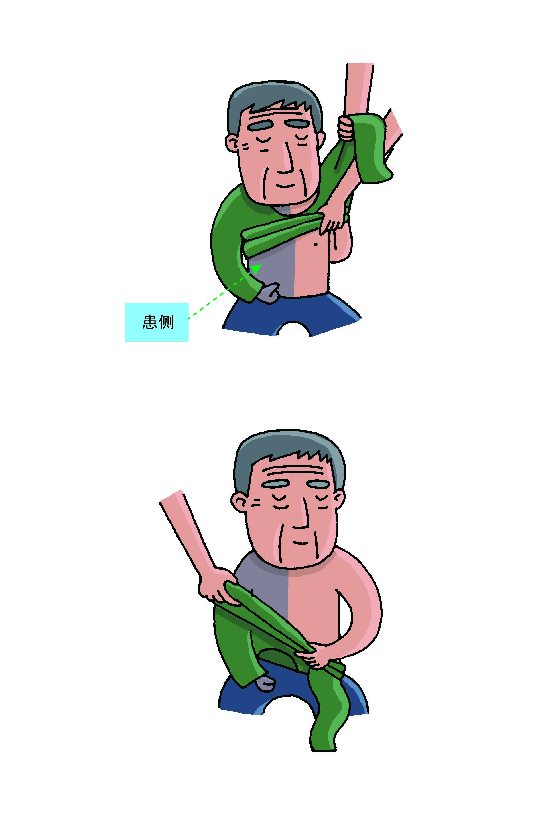2、將麻痹一側(cè)(患側(cè))的手臂從袖子中抽出。