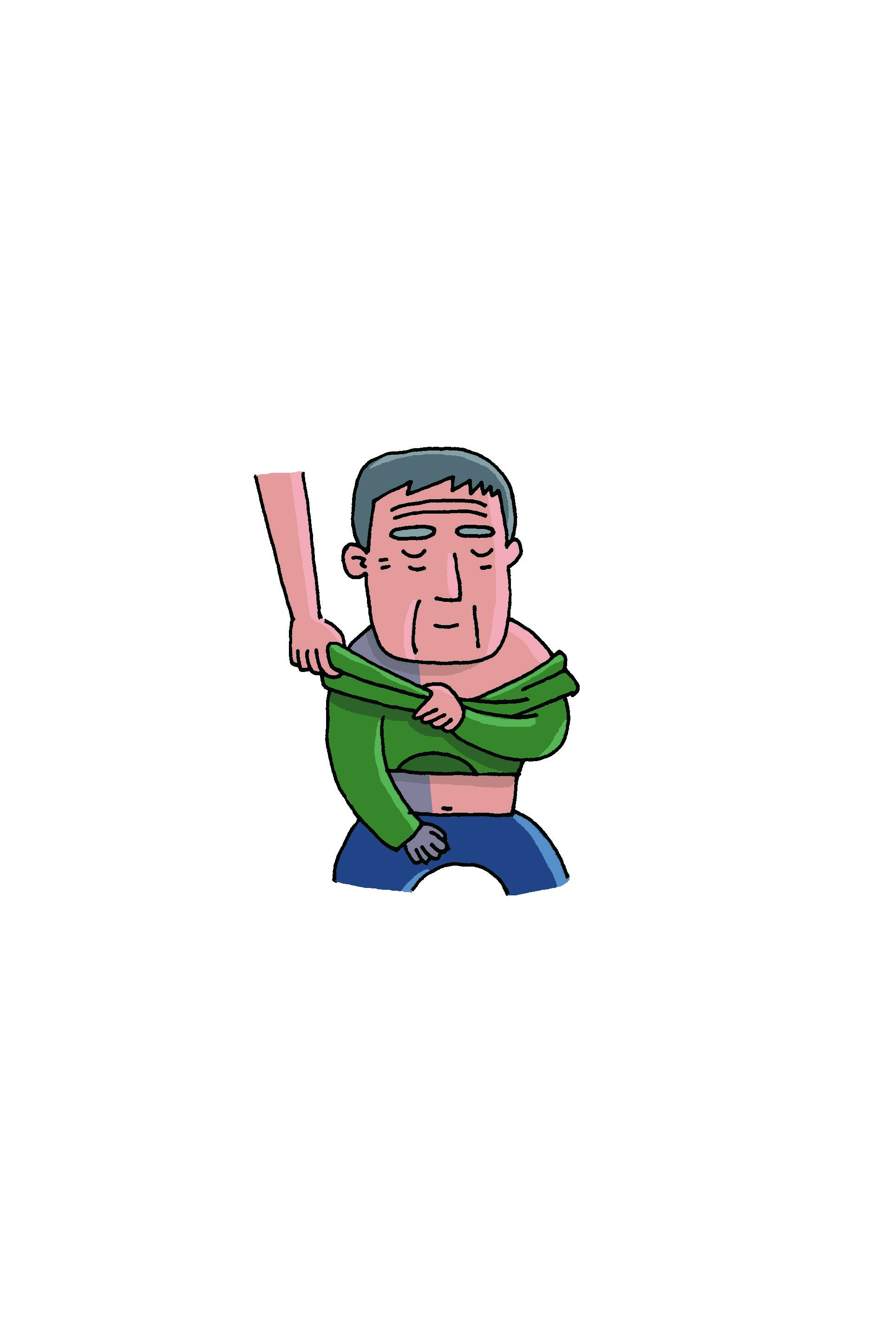 3、從健側(cè)部分江頭從衣服中伸出,再順著患側(cè)手臂將衣服脫下。