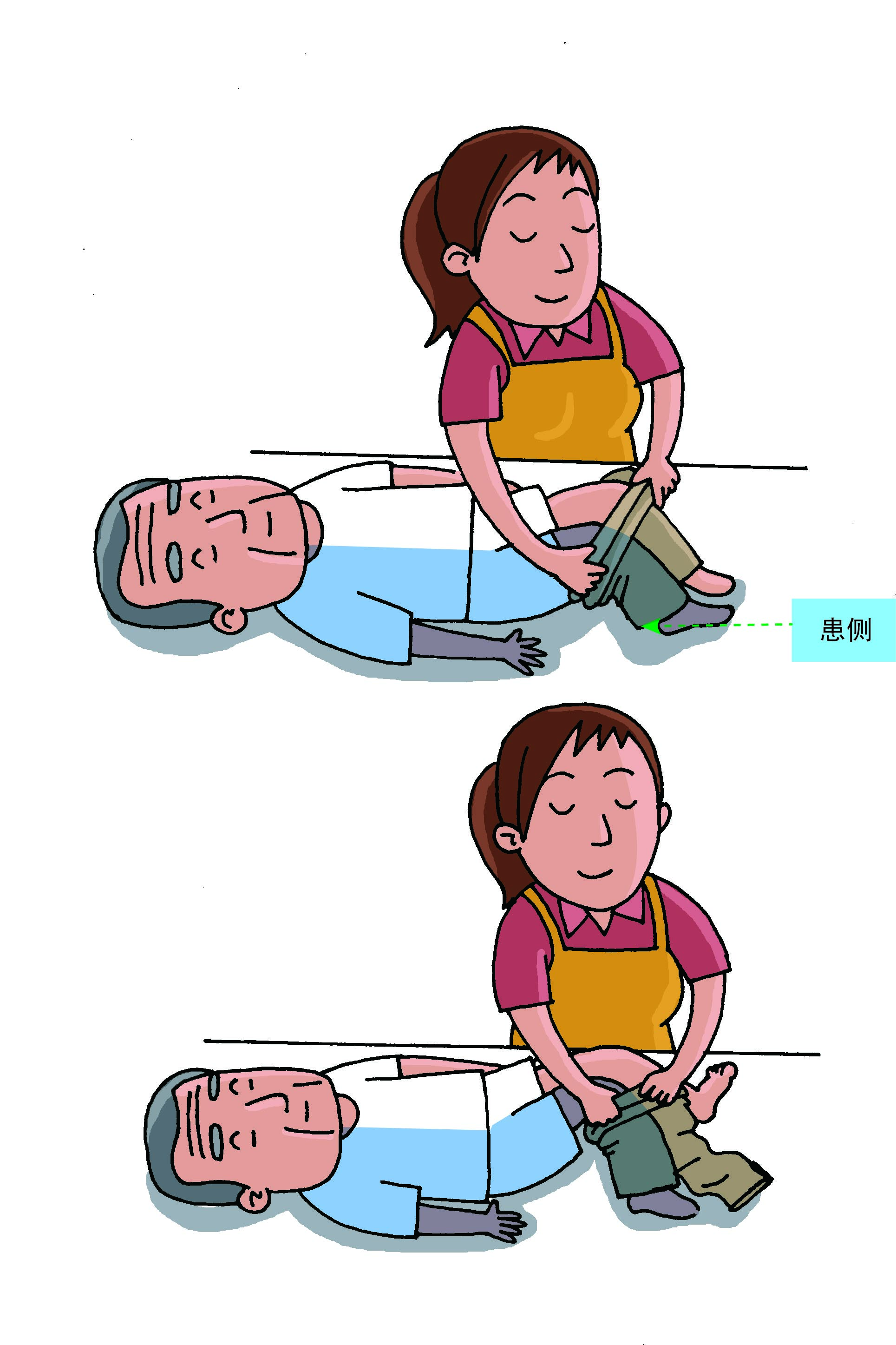 1、將褲管卷起,套進(jìn)患側(cè)腿部,健側(cè)也同樣進(jìn)行。