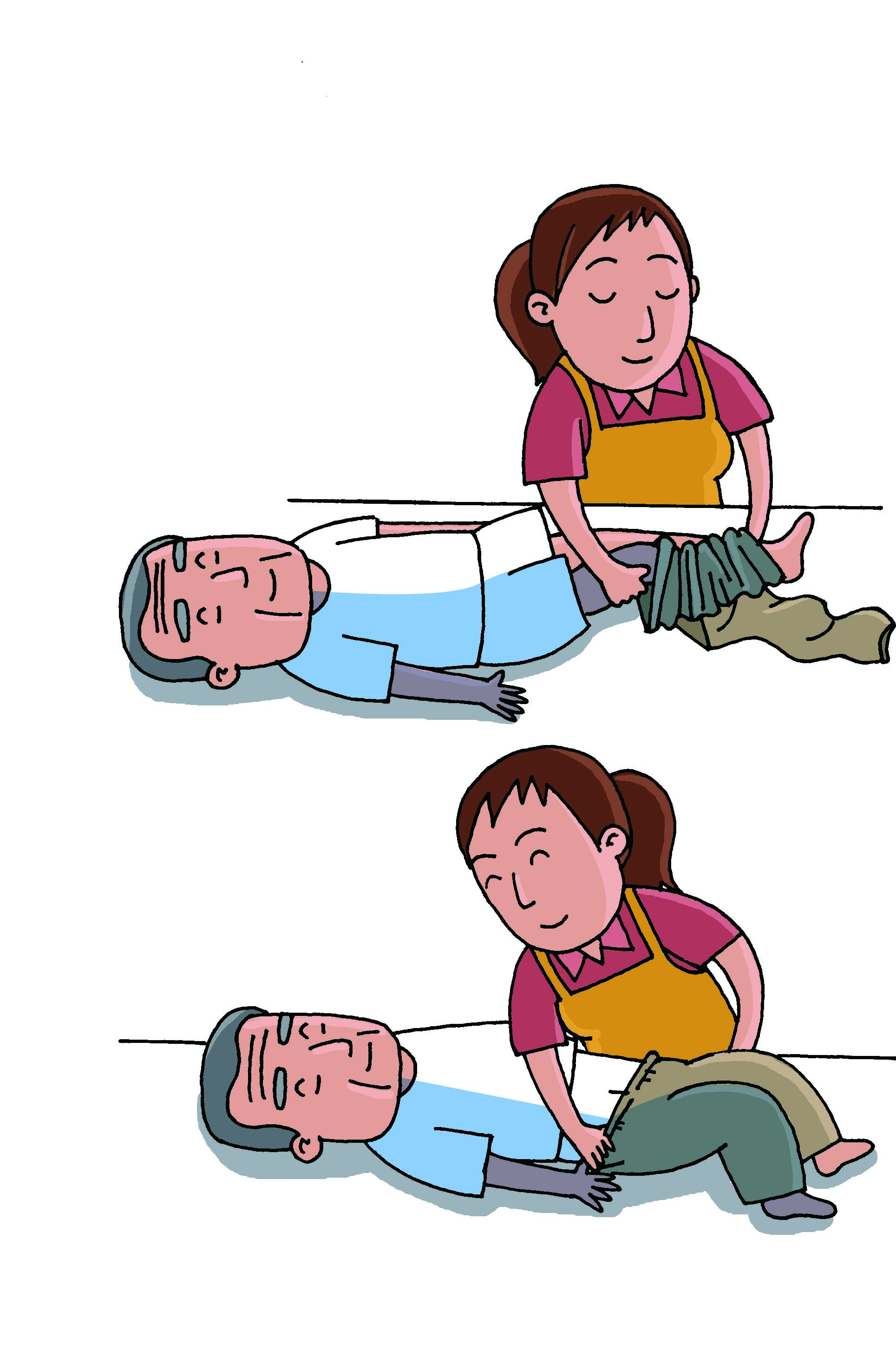 2、讓患者彎曲膝蓋,將手放在腰下使身體懸浮,再將褲子向上拉至腰部。