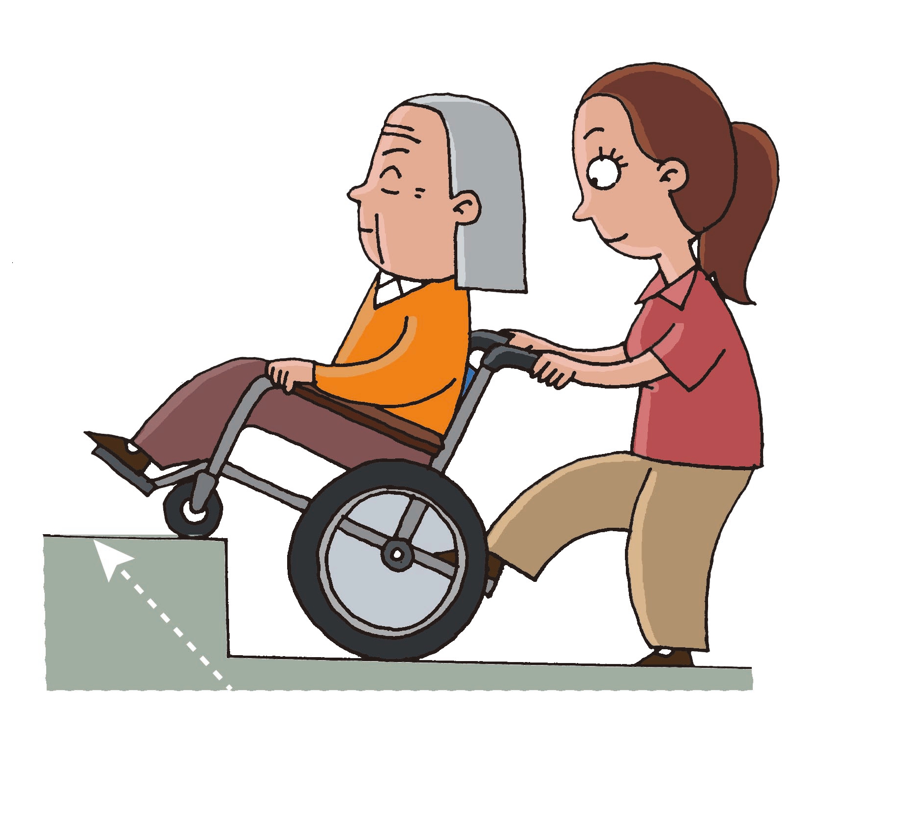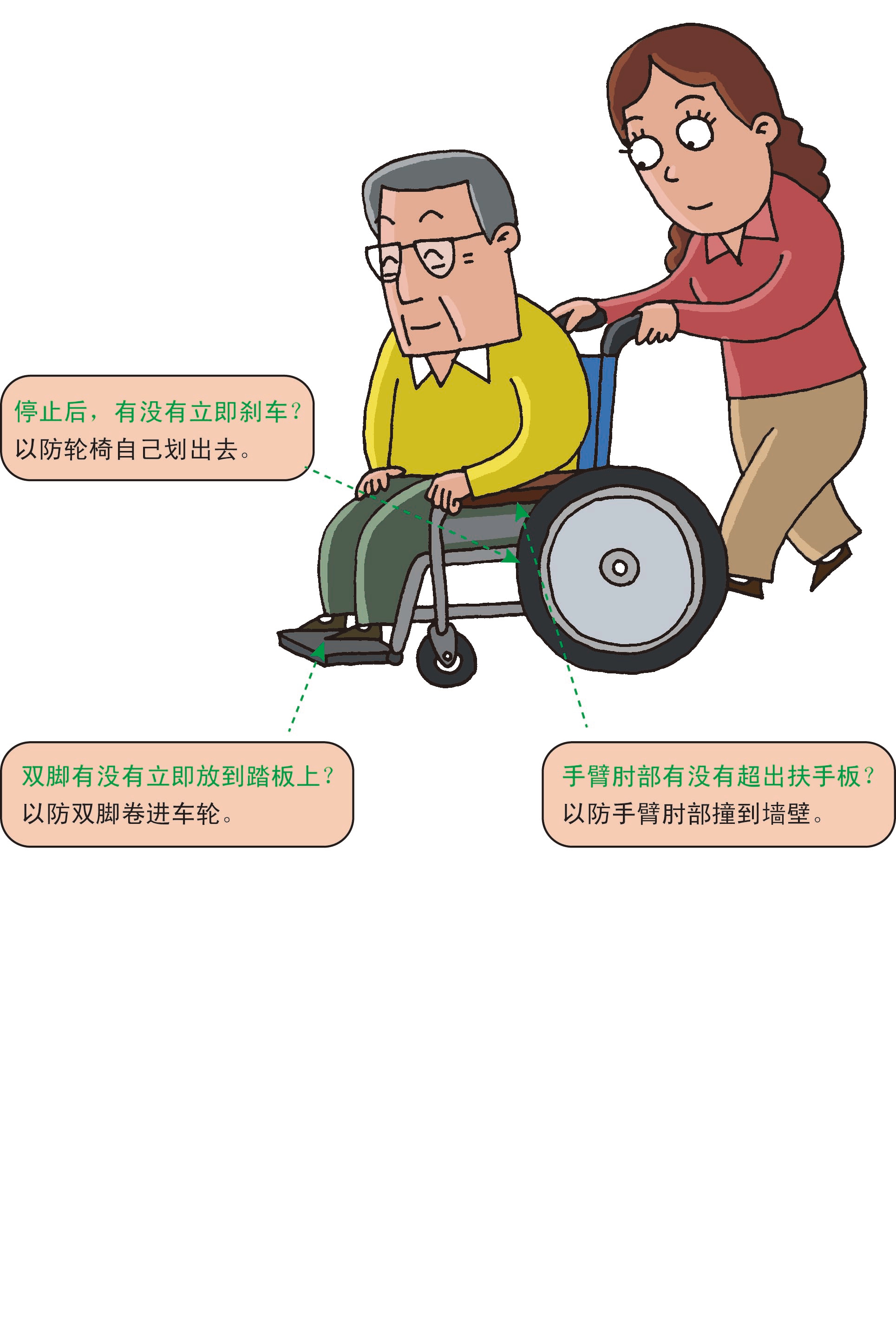 出發(fā)時(shí)要和患者打好招呼,漫漫地、安靜地推動(dòng)輪椅。
