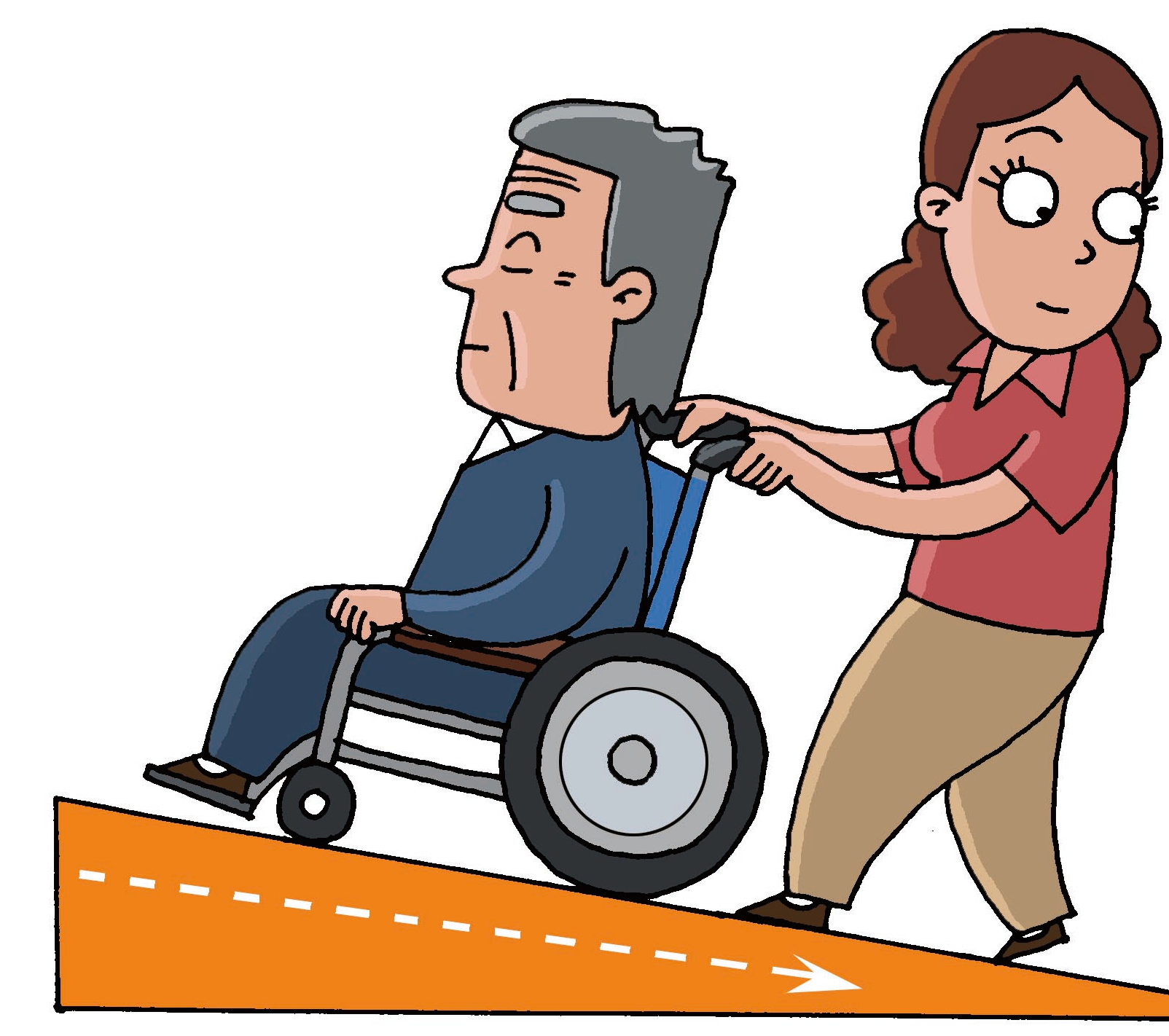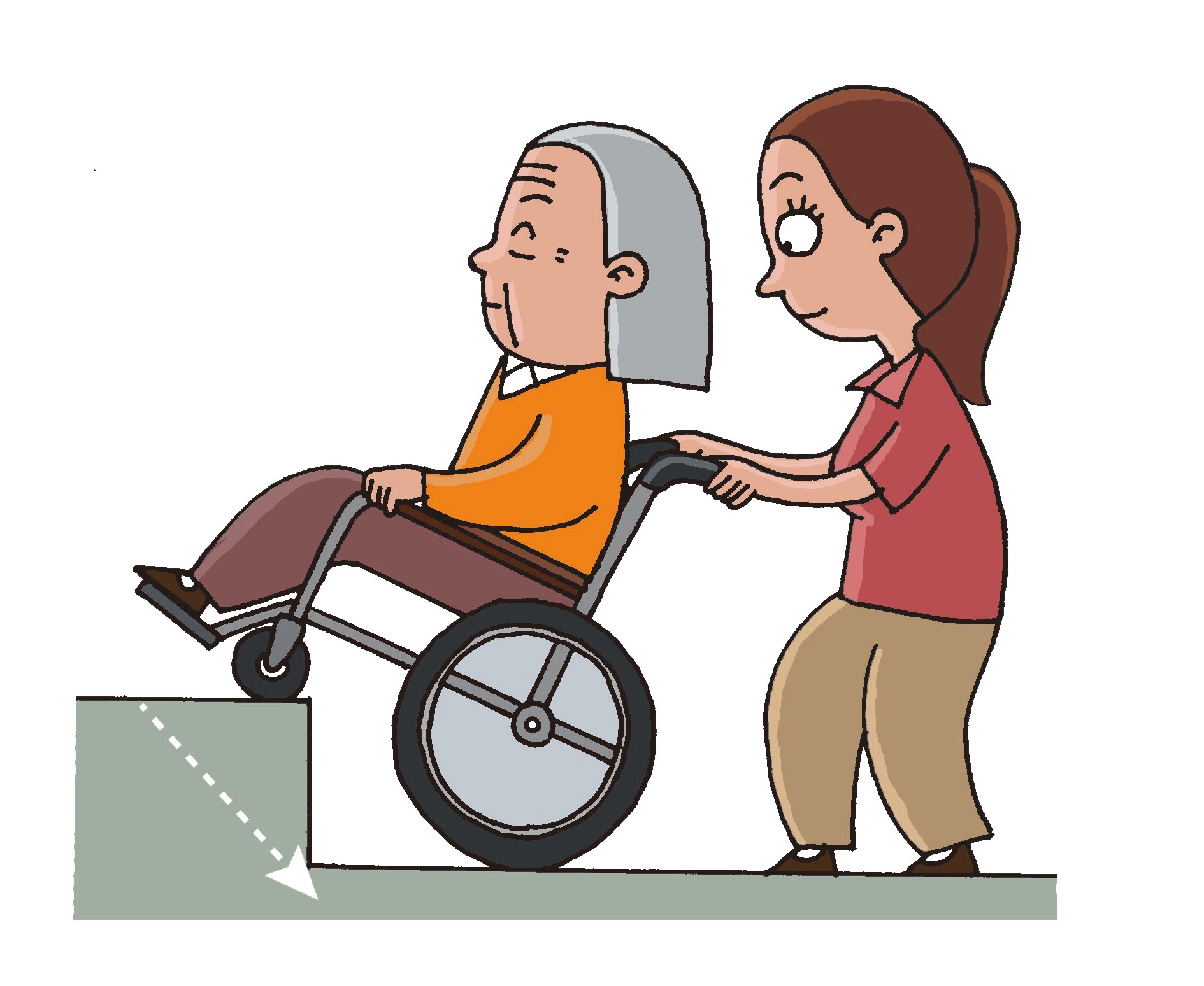 如果是下緩坡道的話,可以身子朝前,將輪椅拉在身前慢慢下坡