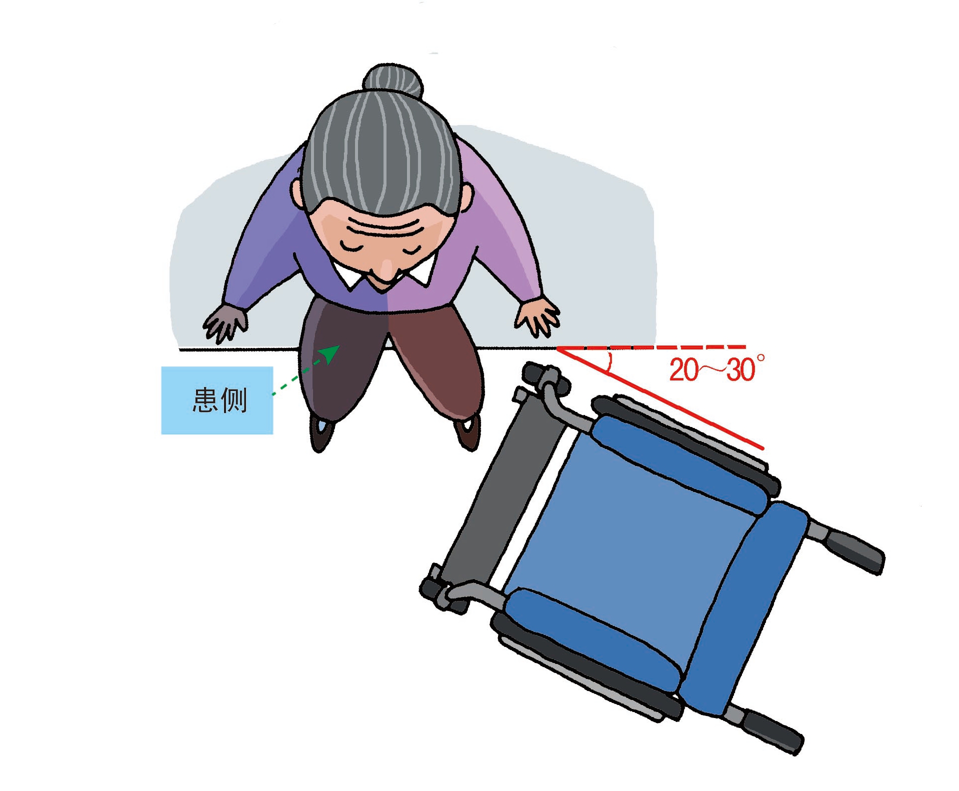 1、將輪椅面向床擺放,傾斜角度大約在20°~30°。