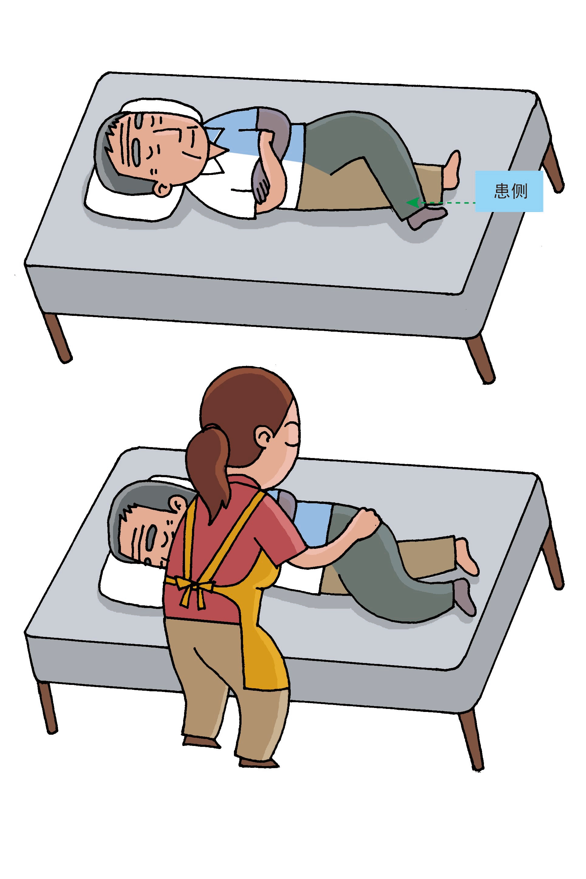 1、讓患者兩臂交叉于胸前,雙膝彎曲。如果患者半身麻痹,按照?qǐng)D例使患側(cè)膝蓋立起,健側(cè)的腳從患側(cè)膝下通過(guò)伸直。