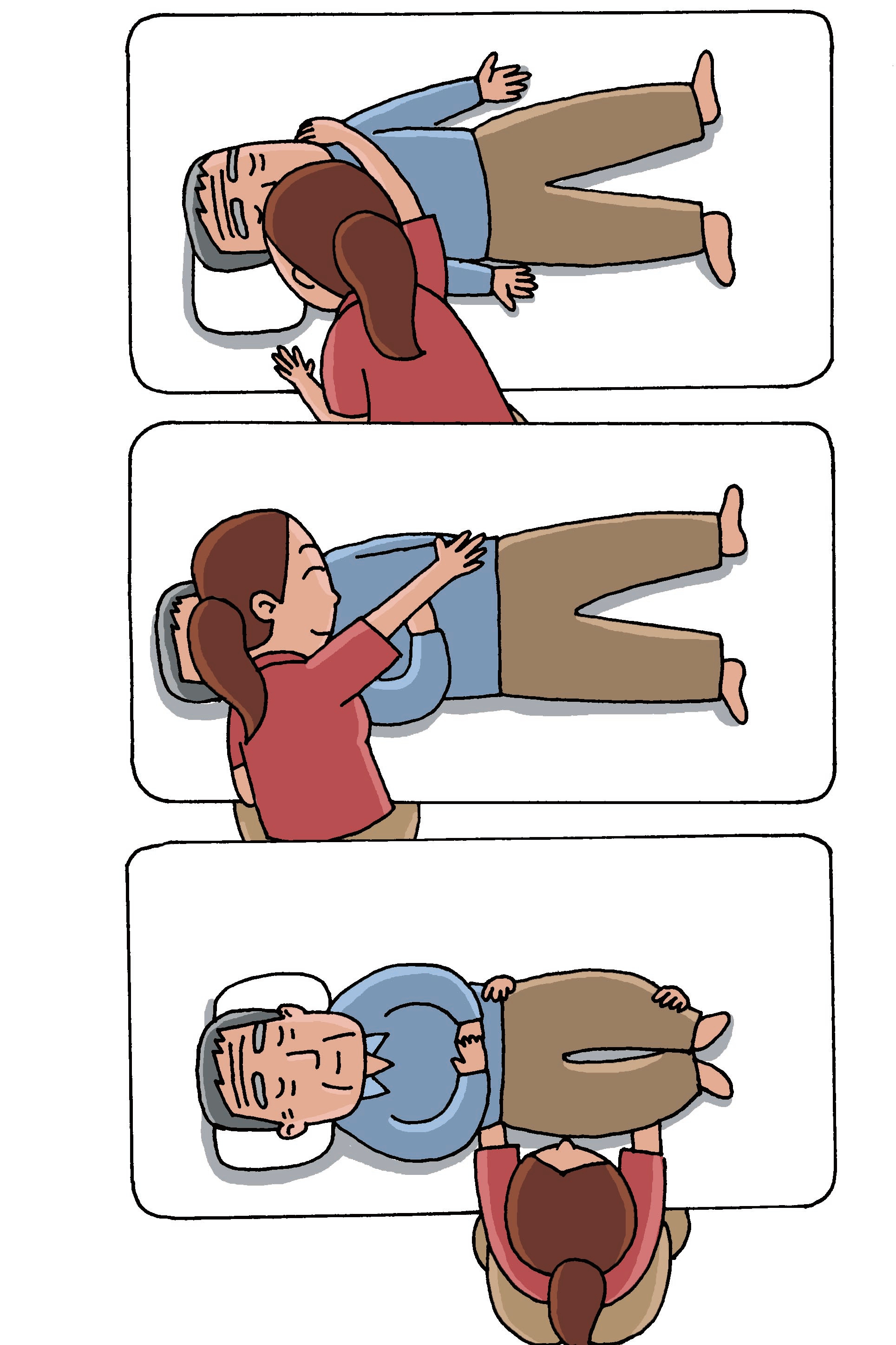 2、讓患者將手臂彎置于胸前,雙膝彎曲,半身麻痹的情況下,按照第45頁(yè)(“如何從仰臥姿勢(shì)轉(zhuǎn)為側(cè)臥姿勢(shì)?”)的做法只彎起一只腳。