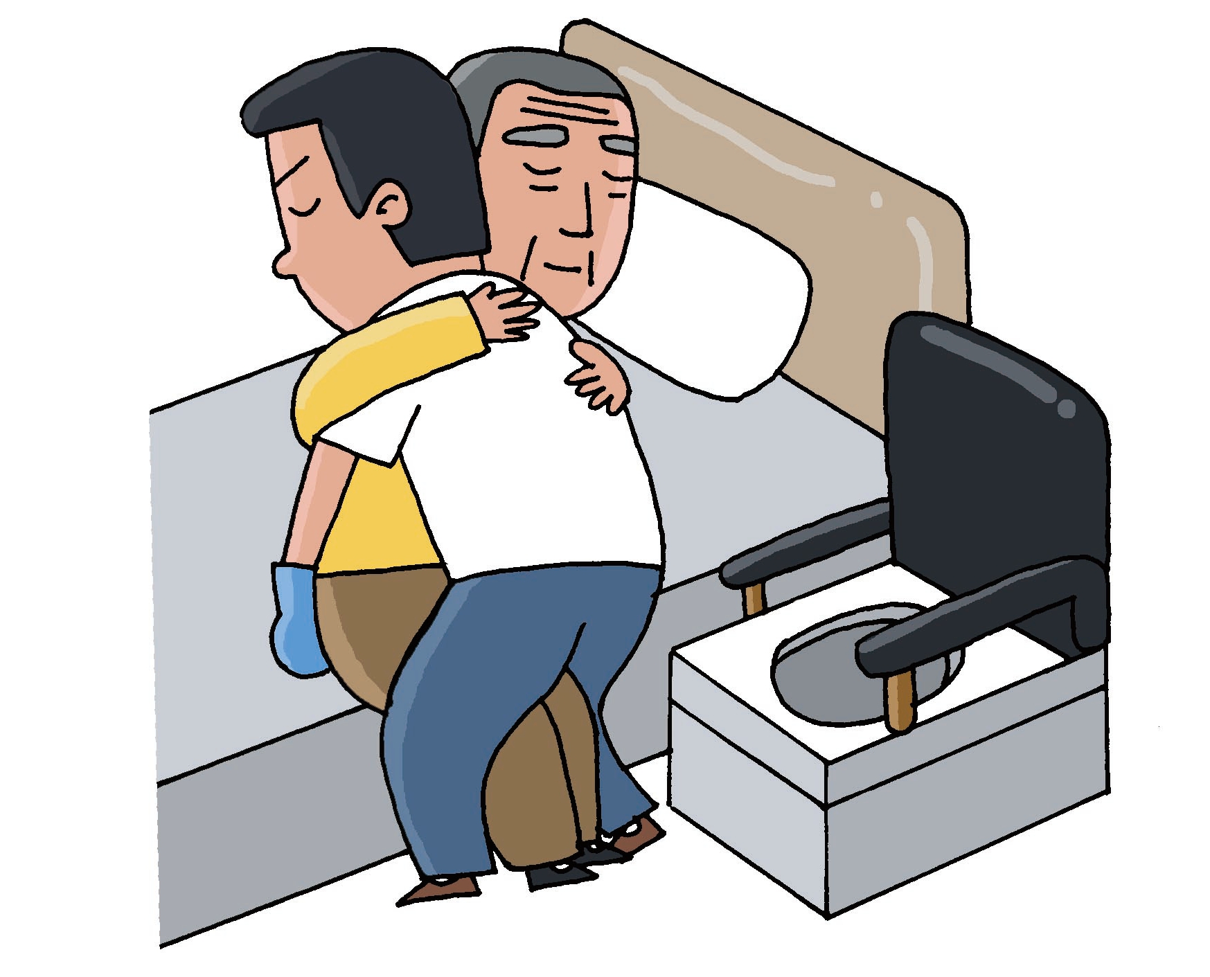 2、讓患者環(huán)抱住護(hù)理者頸部,一邊扶助患者的腰一邊讓他坐在坐便器上。