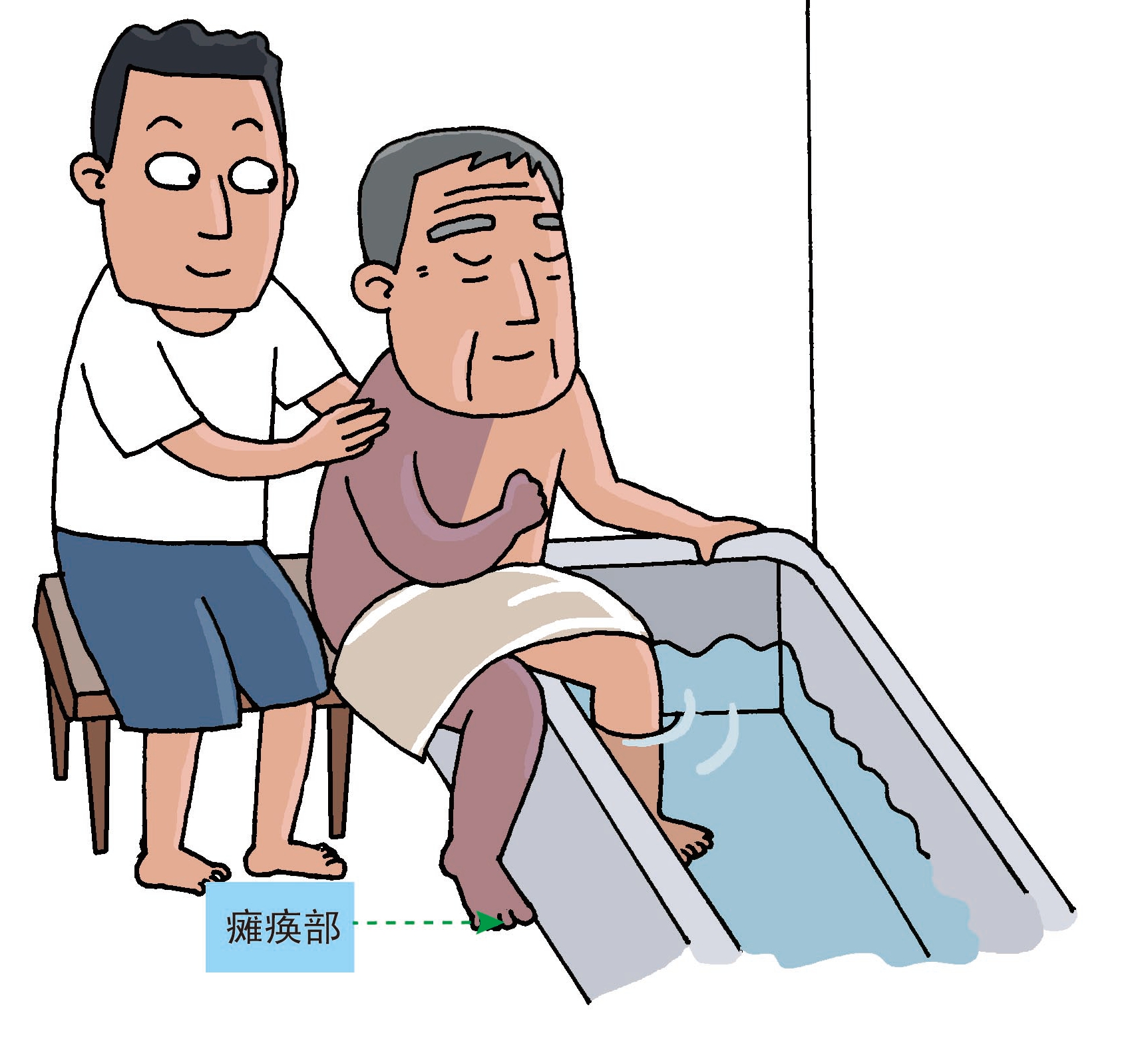 2、護理者扶住患者的背部,將患者的癱瘓的腿放入浴缸。