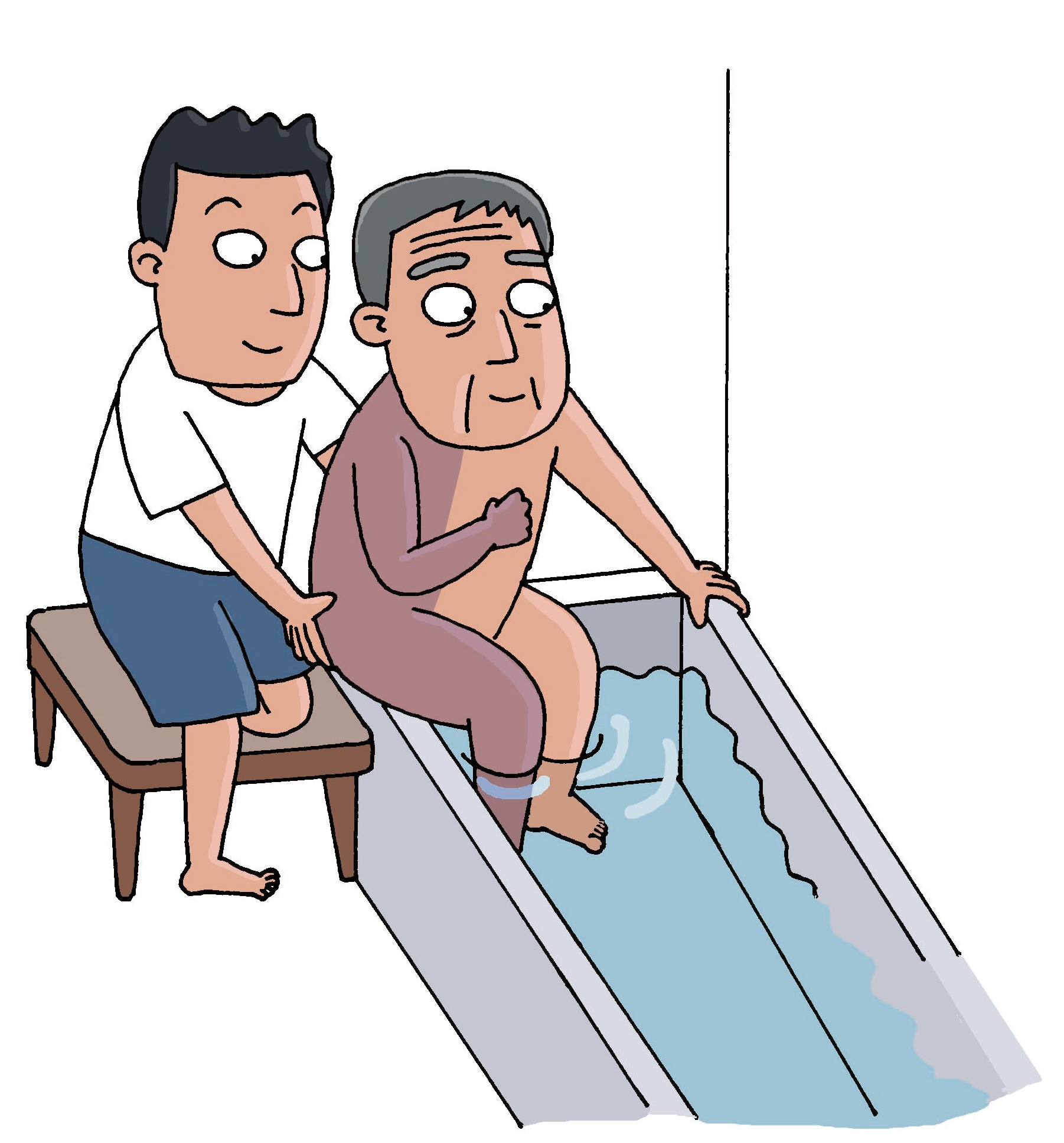 1、讓患者坐在淋浴椅子上,在下腹部蓋上毛巾后讓患者手扶浴缸邊緣,將患者健康的腿跨入浴缸。