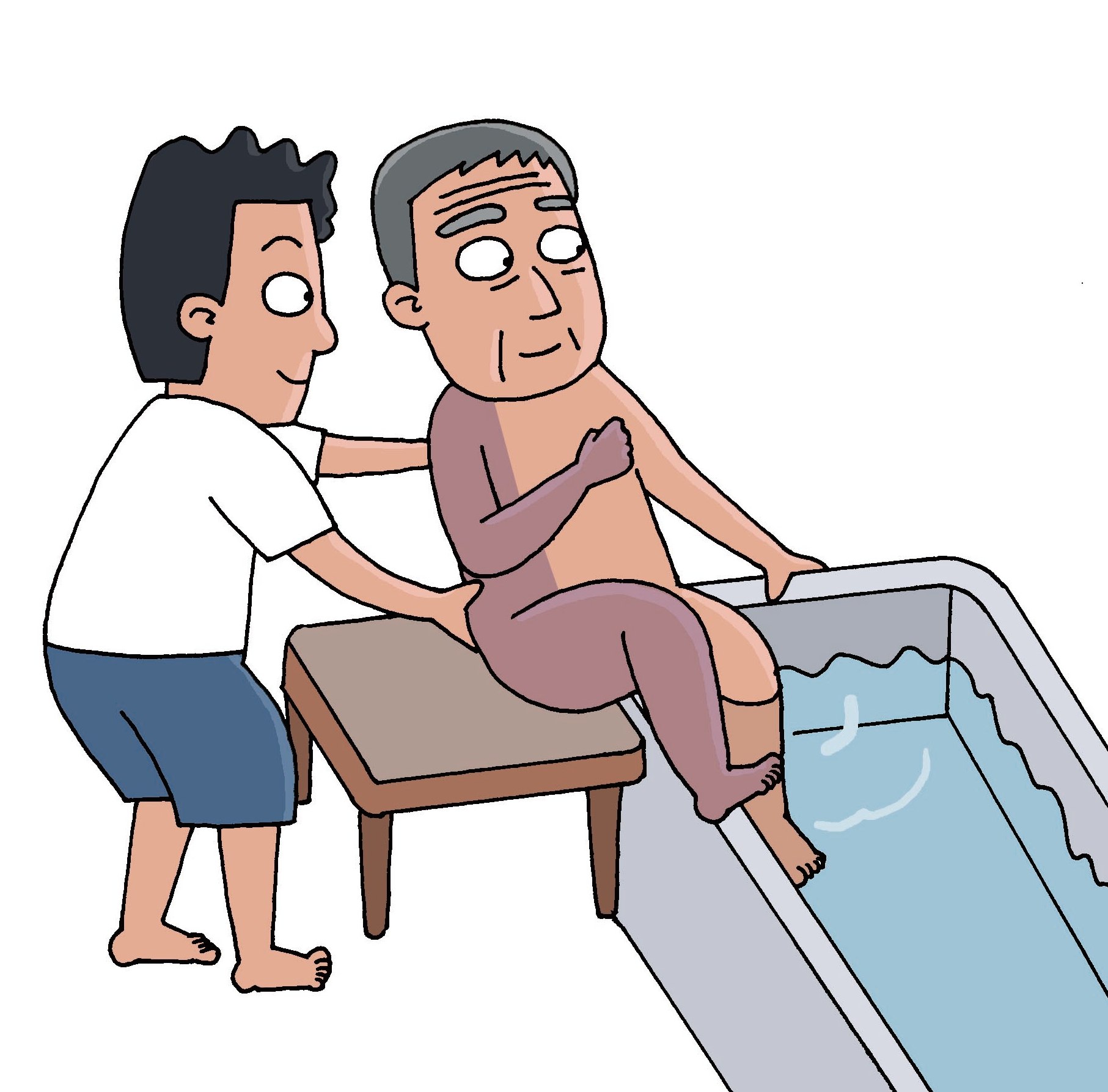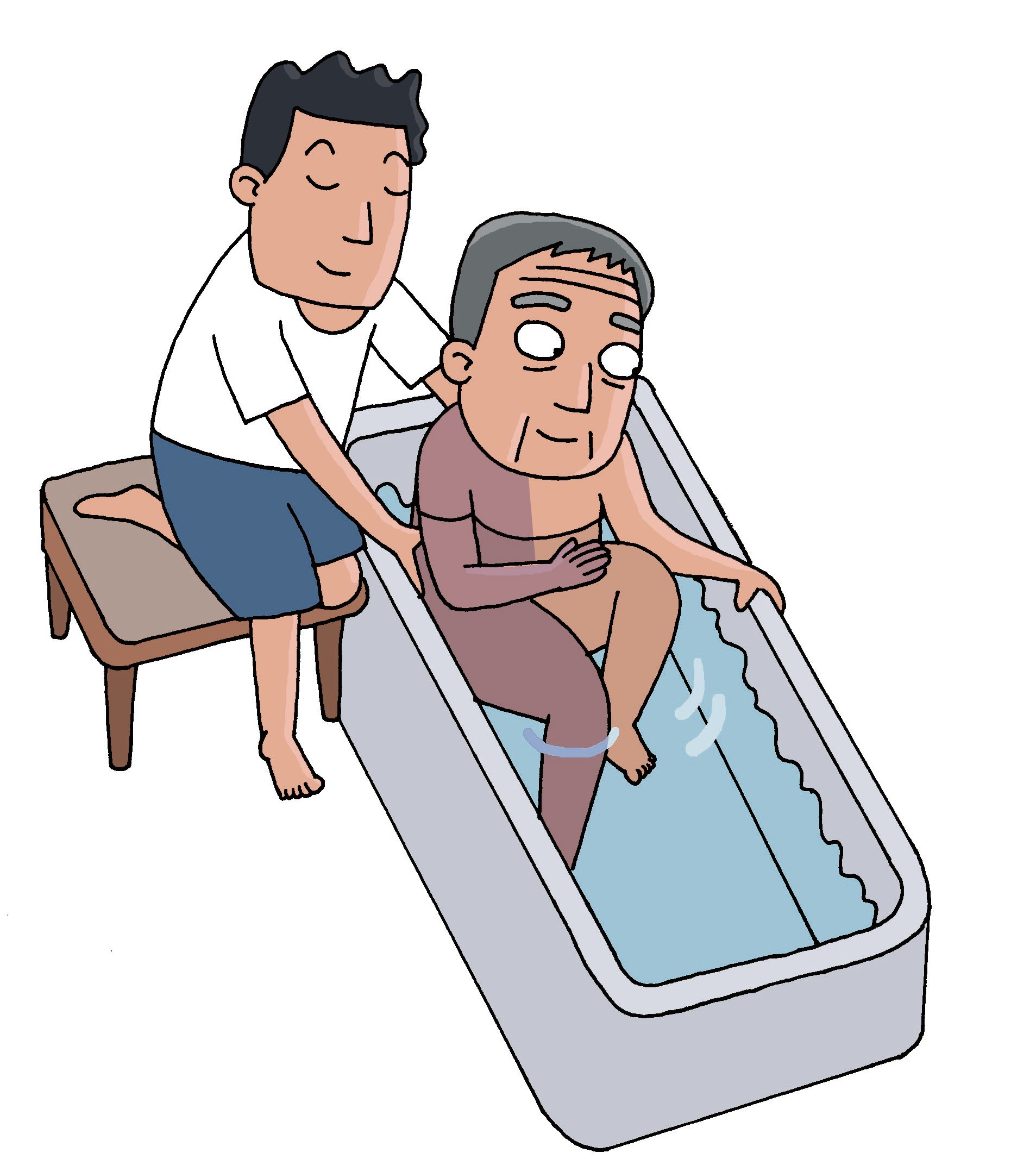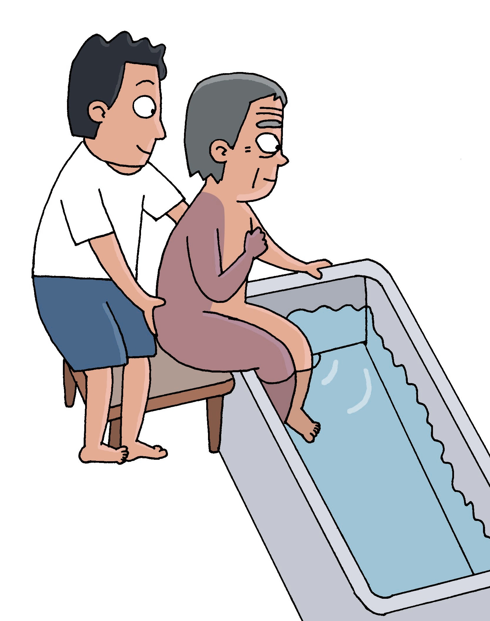 4、患者保持身體前傾的姿勢并扶住浴缸邊緣,護理者將患者臀部向前推。