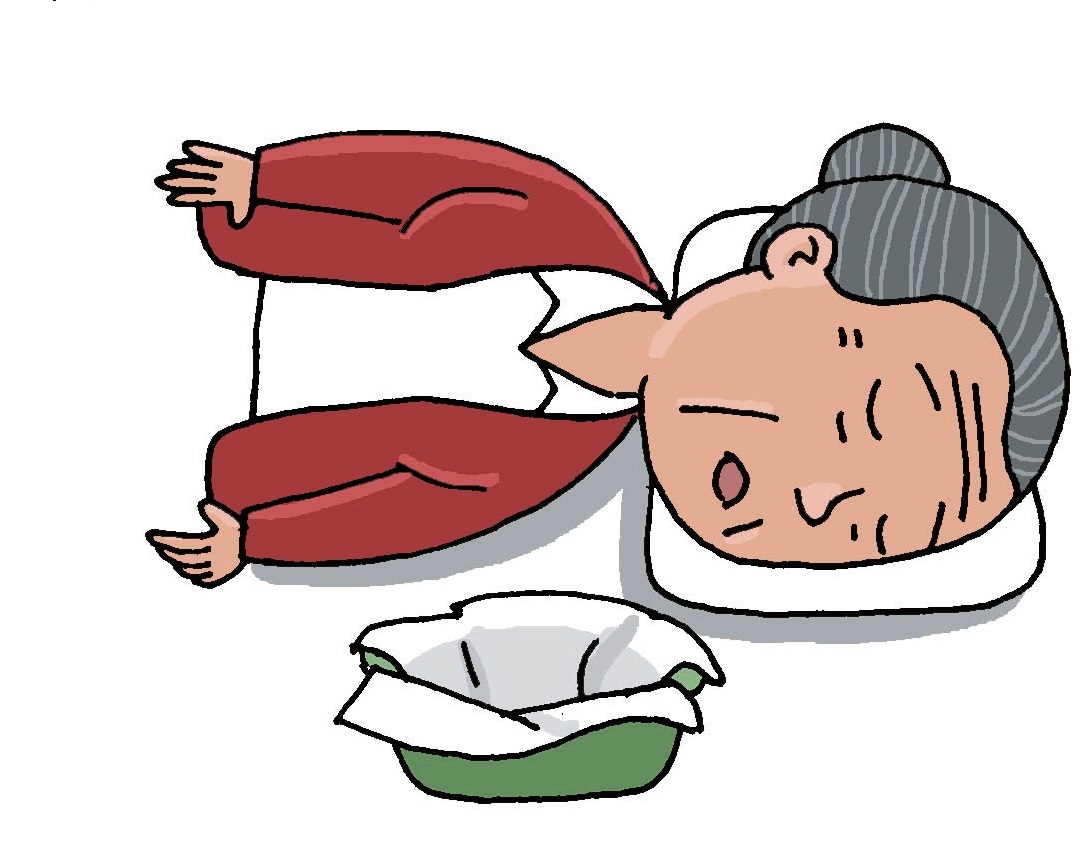 ②松開患者衣服,躺下,臉部側(cè)向一邊(準(zhǔn)備好臉盆)。在無法控制住嘔吐的情況下,為防止窒息要將全身橫躺。