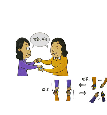�、馨褌鞯阶笫稚系纳嘲f到右手,并重復(fù)以上同樣的動(dòng)作。