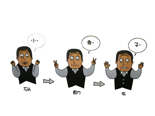不僅是手,身子也一起擺動(dòng)起來(lái),石頭(將身子蜷縮起來(lái)),剪刀(兩手向前伸出),布(做出萬(wàn)歲的動(dòng)作)。