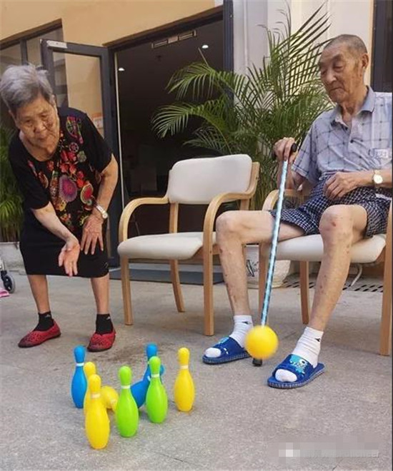 ▲在普親養(yǎng)老,王爺爺和柴奶奶一起打保齡球,退役多年,王爺爺?shù)拿闇誓芰是沒忘。