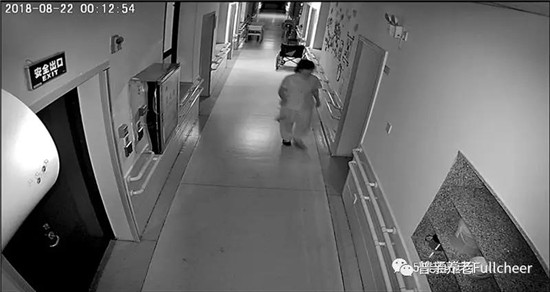 ▲深夜12點,在長沙市普親先鋒社區(qū)老年養(yǎng)護中心的過道里看到值夜班護理員的身影