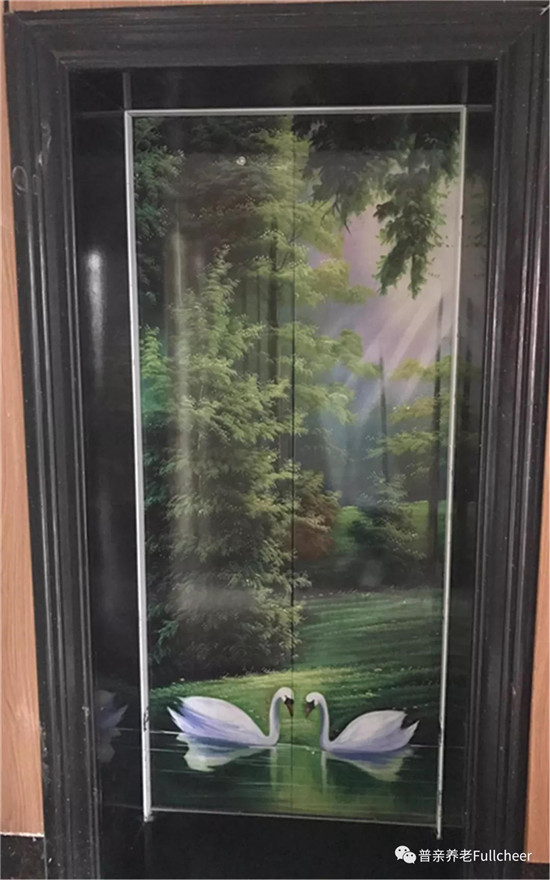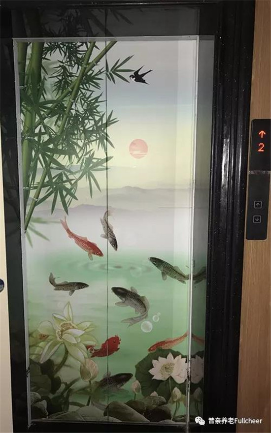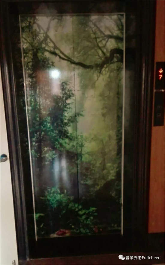 電梯是機構(gòu)主要的出入渠道。在普親養(yǎng)老,我們在電梯門上也做了不少文章,用款式各異的壁紙就能營造出別樣的氛圍。
