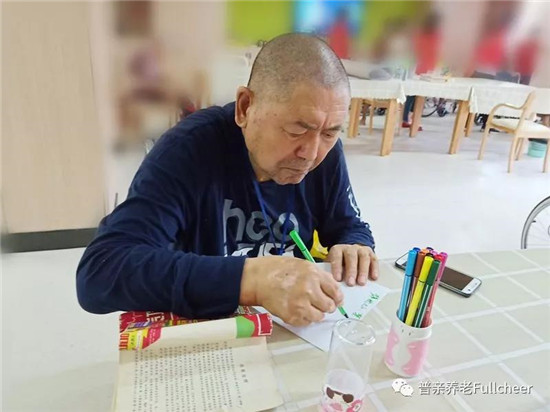 ▲海口市普親第二老年養(yǎng)護院的爺爺在經(jīng)過慎重思考畫的結(jié)構(gòu)、布局、用色之后寫了四個大字,也是很棒了。