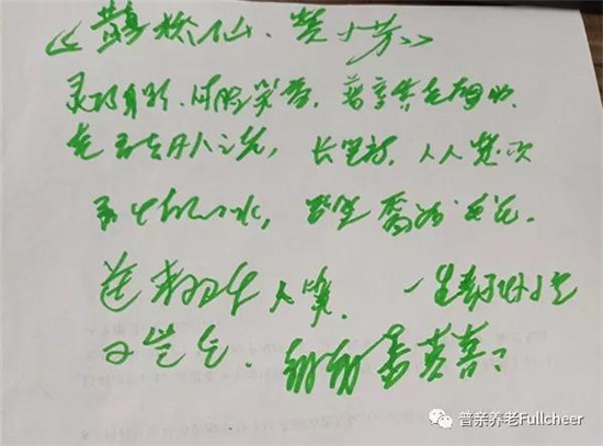 七夕這天,海口市普親老第二老年養(yǎng)護院的孫爺爺為小芳寫了一首《鵲橋仙·贊小芳》。