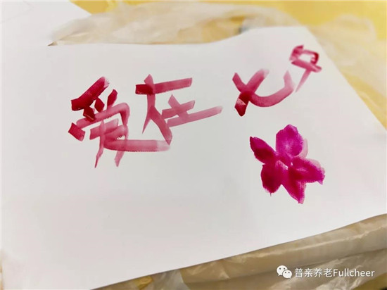 ▲長沙市普親先鋒社區(qū)老年養(yǎng)護中心的爺爺奶奶們用畫筆繪成活動主題海報。