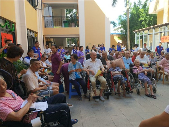 每周定期過來的基督教志愿者們,每次都帶來了水果看望爺爺奶奶,陪他們聊天,帶他們唱歌。