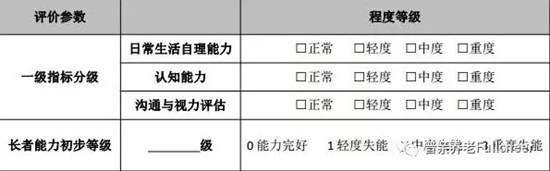 生活能力評(píng)估包括吃飯、大小便、穿衣等日常生活內(nèi)容,判斷老人能不能自己完成,自己有沒(méi)有感知。我們也會(huì)通過(guò)對(duì)老人的直觀感覺(jué)和家屬提供的信息來(lái)進(jìn)行判斷老人的溝通與視聽(tīng)力能力。