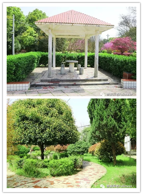 ⬆養(yǎng)護(hù)中心外的綠色休閑花園,樹(shù)木蔥蔥郁郁,曲徑通涼亭,特別適合老人們飯后茶余閑暇散心。