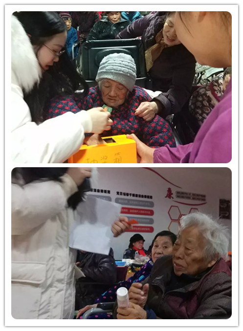 緊接著的第二輪抽獎,讓現(xiàn)場變得活潑起來。我們邀請了養(yǎng)護中心95歲高齡的姚奶奶為大家抽獎,姚奶奶頗有懸念地在抽獎箱內(nèi)選了一會兒,讓身旁的觀眾既焦急又期待。