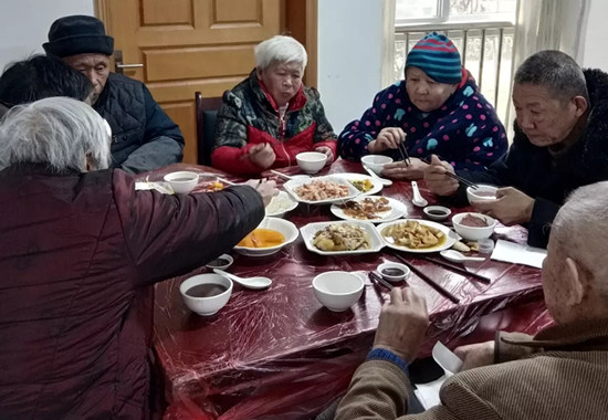 豐盛可口的飯菜擺滿一桌,各位老人們圍坐桌旁,共吃團圓飯;老人們既是享受美味可口的菜肴,亦是享受歡聚一堂的氣氛。