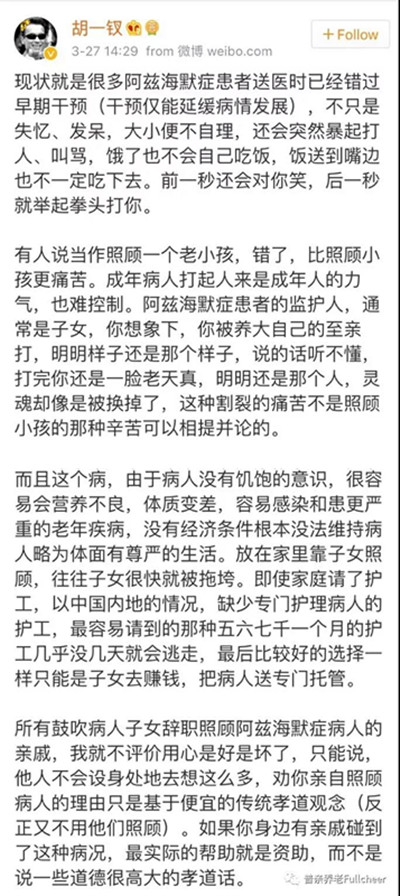 他會毫無理由的發(fā)怒,嚎叫,甚至向你揮舞拳頭,他不是不愛你了,也不是恨你,他只是患上了阿爾茲海默癥。一個(gè)受過專業(yè)訓(xùn)練的專職護(hù)工,也會在偶爾的照護(hù)工作結(jié)束后悄悄落淚,更何況是毫無專業(yè)照護(hù)能力的兒女,我們能做的,就是多給予老人關(guān)心,多溝通多交流,當(dāng)發(fā)現(xiàn)有癥狀存在的苗頭時(shí),積極帶老人看醫(yī)生;如果已發(fā)展成疾病,也要相信專業(yè)的力量,不要盲目覺得辭職照顧老人就是孝順,應(yīng)該把錢花在更重要的地方,讓老人得到好的專業(yè)照護(hù),給他足夠的陪伴,這才是對大家都挺好的結(jié)果。