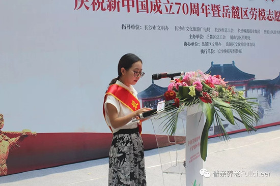2019年5月24日,由長沙市岳麓區(qū)總工會、麓山景區(qū)管理處主辦,岳麓區(qū)文明辦、岳麓區(qū)文化旅游體育局協(xié)辦,長沙晚報星恒傳媒承辦的慶祝新中國成立70周年暨岳麓區(qū)勞模志愿服務主題活動《弘揚勞模精神,守護綠水青山》在岳麓區(qū)風景名勝區(qū)愛晚亭舉辦,普親先鋒社區(qū)老年養(yǎng)護中心站長余莉榮獲勞模稱號并作代表發(fā)言。