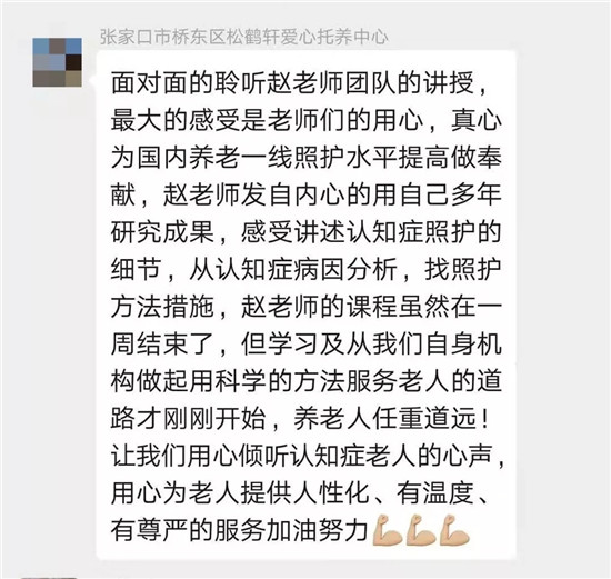 在非藥物干預(yù)的章節(jié)里,趙老師為我們這樣舉例:認(rèn)知癥老人就像一部16G的手機(jī),手機(jī)并沒有壞,只是內(nèi)存儲(chǔ)備不再夠用,即老人的感受并沒有喪失,只是無法再將感受存儲(chǔ)進(jìn)大腦。在照護(hù)中,我們要充分尊重老人,明確護(hù)理是一個(gè)行為;而作為管理者,一定不能忽視非藥物療法在長期照護(hù)中的作用,要讓整個(gè)團(tuán)隊(duì)都有此方面的意識(shí)。