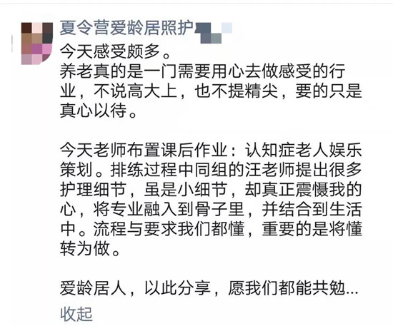 8月17日,為期六天的2019中日老年照護(hù)實(shí)務(wù)訓(xùn)練夏令營圓滿結(jié)束。返回工作崗位后,很多學(xué)員在群里、朋友圈分享了此次學(xué)習(xí)的感悟。