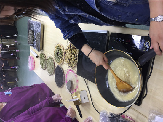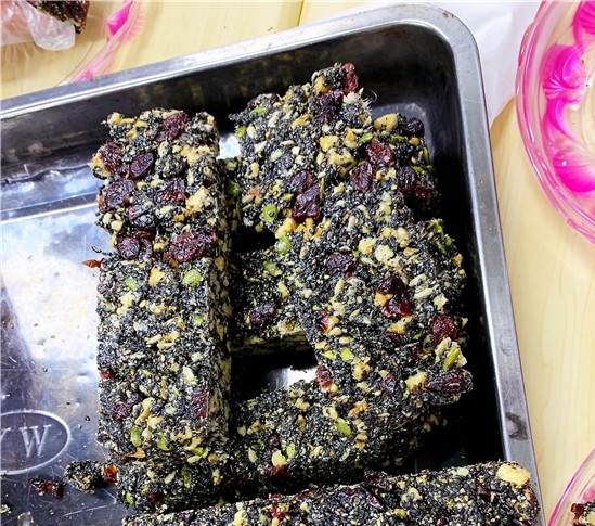 原材料都是工作人員早已準(zhǔn)備好的食材,烤熟的核桃、芝麻、瓜子仁和蔓越莓香氣四溢,熬煮的麥芽糖讓整個(gè)活動(dòng)大廳都充滿甜蜜的香味。