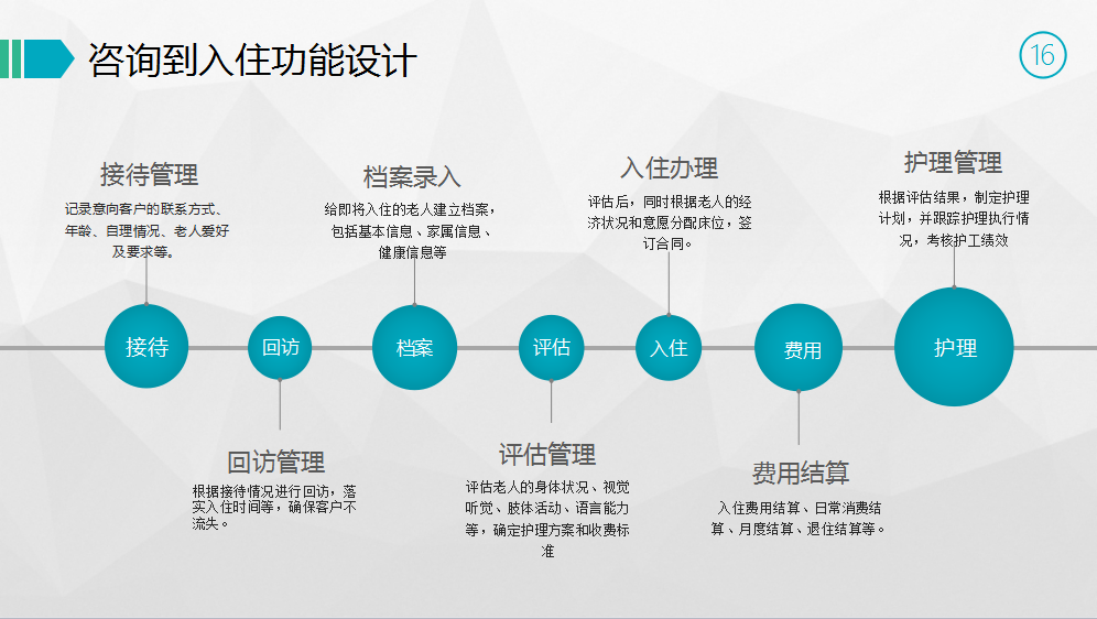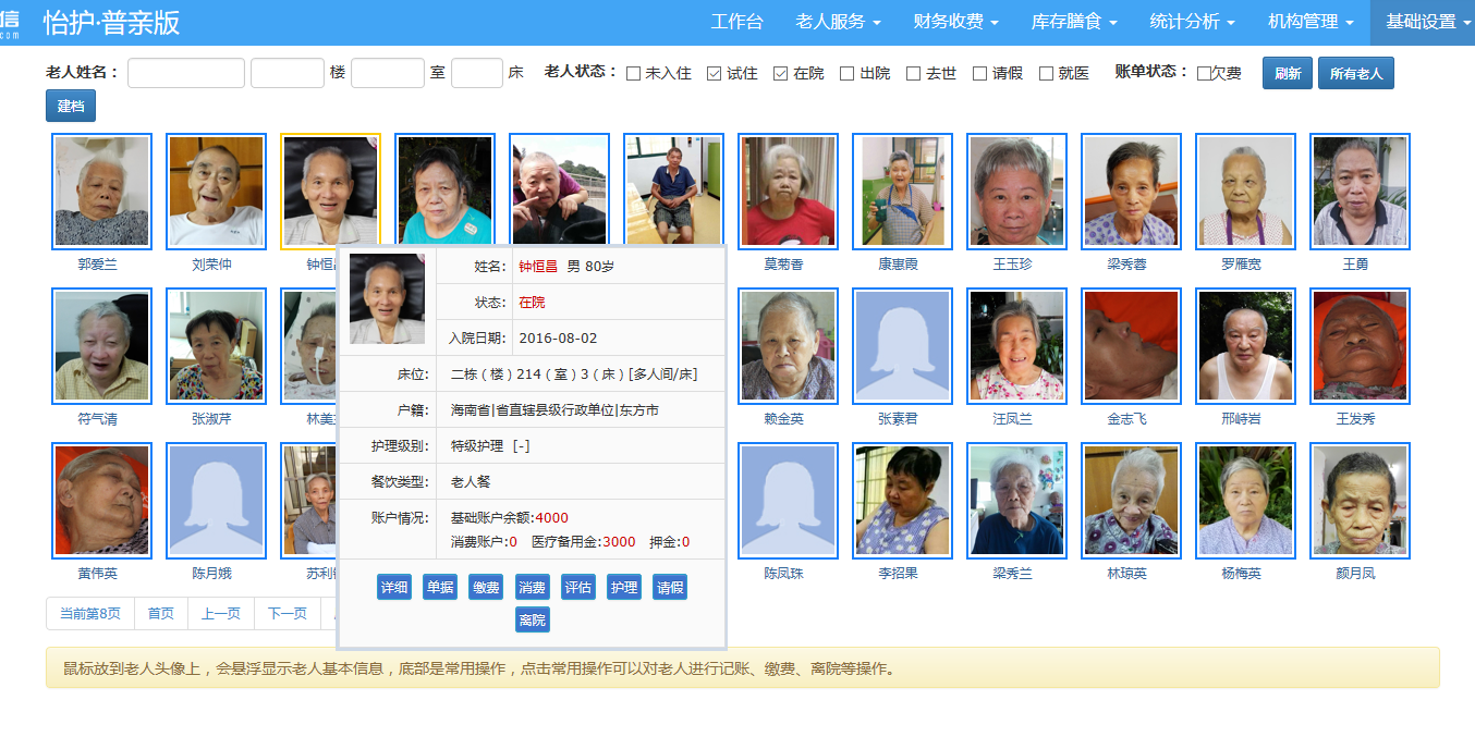 采用行業(yè)領(lǐng)先的怡護(hù)養(yǎng)老管理系統(tǒng),從老人的咨詢(xún)接待開(kāi)始將個(gè)人信息錄入系統(tǒng),到老人入住評(píng)估,日常消費(fèi)及護(hù)理,均在系統(tǒng)里進(jìn)行記錄。實(shí)現(xiàn)了對(duì)所有養(yǎng)老機(jī)構(gòu)的一站式管理,有效提高了系統(tǒng)化管理水平和服務(wù)質(zhì)量,實(shí)現(xiàn)檔案共享、業(yè)務(wù)流程化,推動(dòng)機(jī)構(gòu)健康有效發(fā)展。