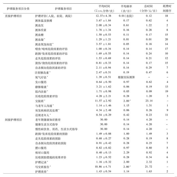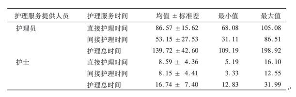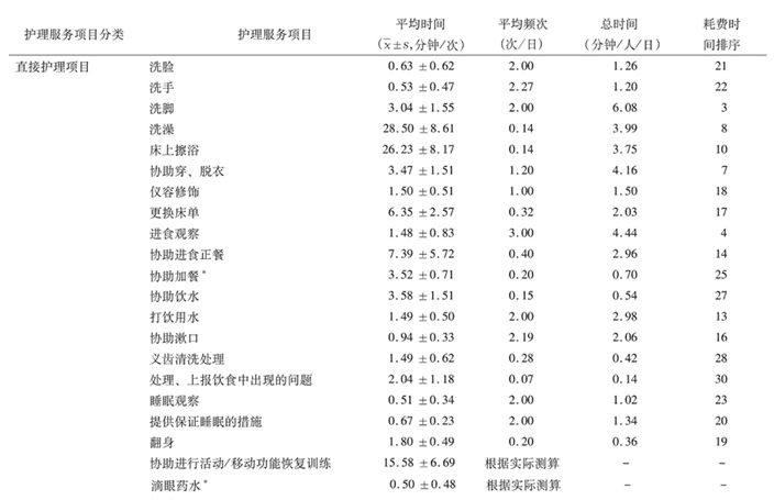 護士所提供護理服務流程參照《基礎(chǔ)護理服務工作規(guī)范》和《常用臨床護理技術(shù)服務規(guī)范》,再對各直接護理項目進行多次測量取其平均值。測量采用專用計時秒表。