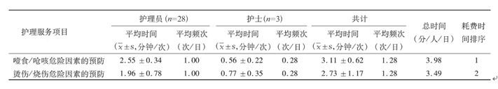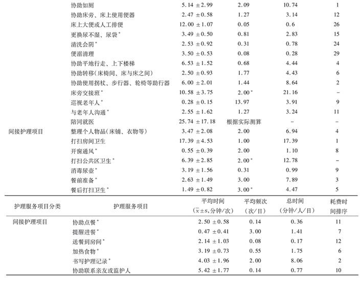 表1、養(yǎng)老機構(gòu)輔助生活區(qū)護理員提供服務平均時間及平均頻次( n = 28 )