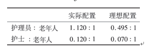 通過工時測定法計算所得護理員日均直接護理時間,多于日均間接護理時間,護士直接護理時間和間接護理時間無統(tǒng)計學差異;養(yǎng)老機構(gòu)輔助生活區(qū)養(yǎng)老護理員、護士與老年人的實際配比,分別為 1.120∶1 和 0.120∶1 ,理想配比分別為 0.495∶1 和 0.070∶1 。