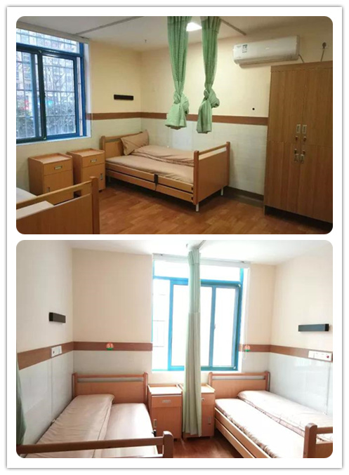 起居室在設(shè)計上以「溫暖」為核心,主張凸顯「家的味道」,在配色上以原木色為主,輔以淡雅的綠色,打造舒適的起居空間;同時充分考慮入住長者的生理和心理特點,配備緊急呼叫系統(tǒng)、全自動護理床、圓角家具等,保證長者安全,便利長者生活。